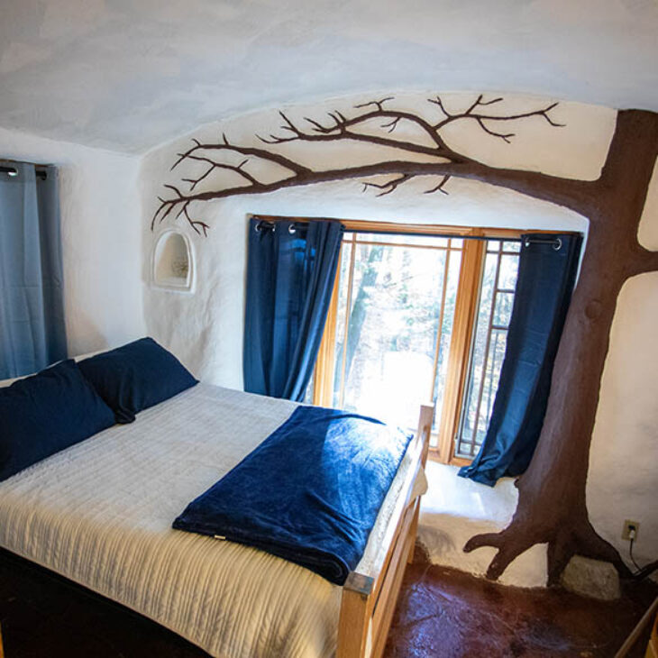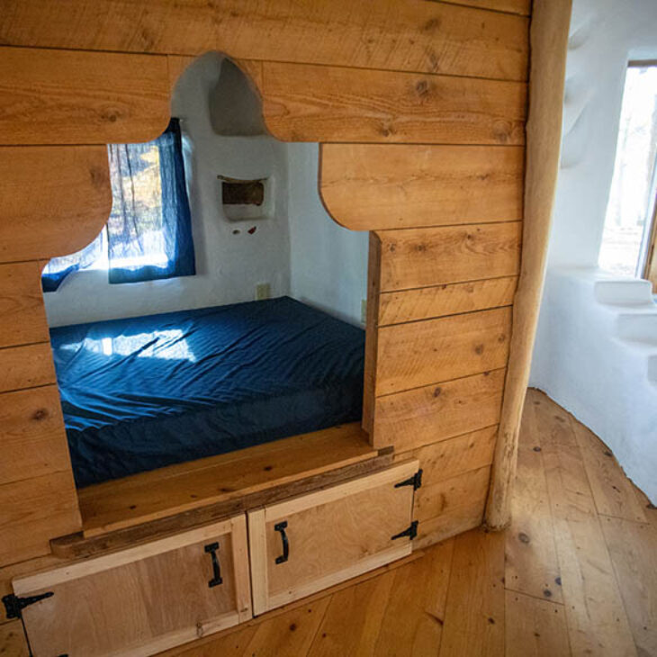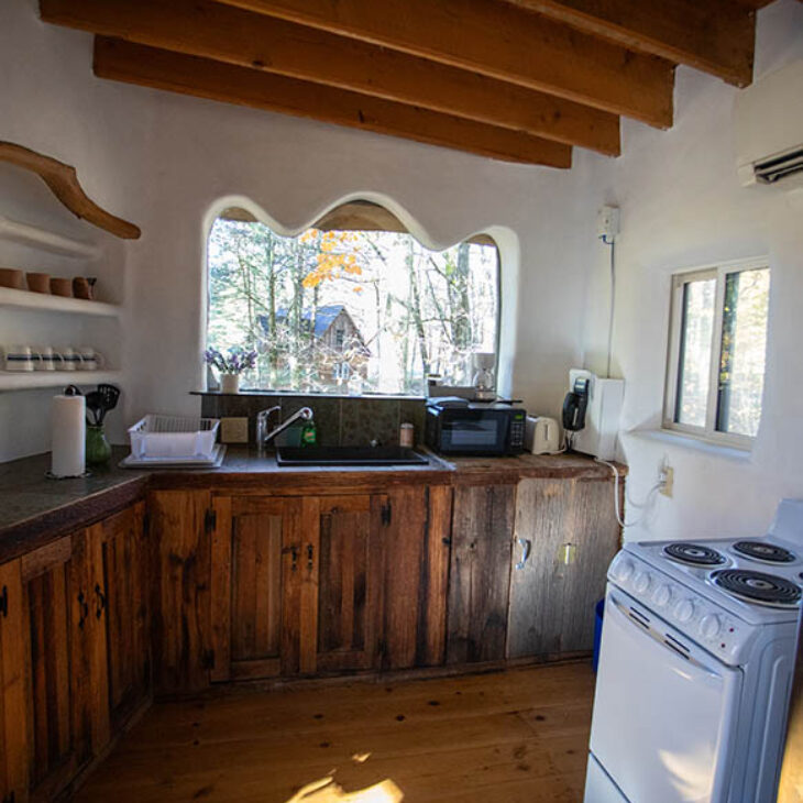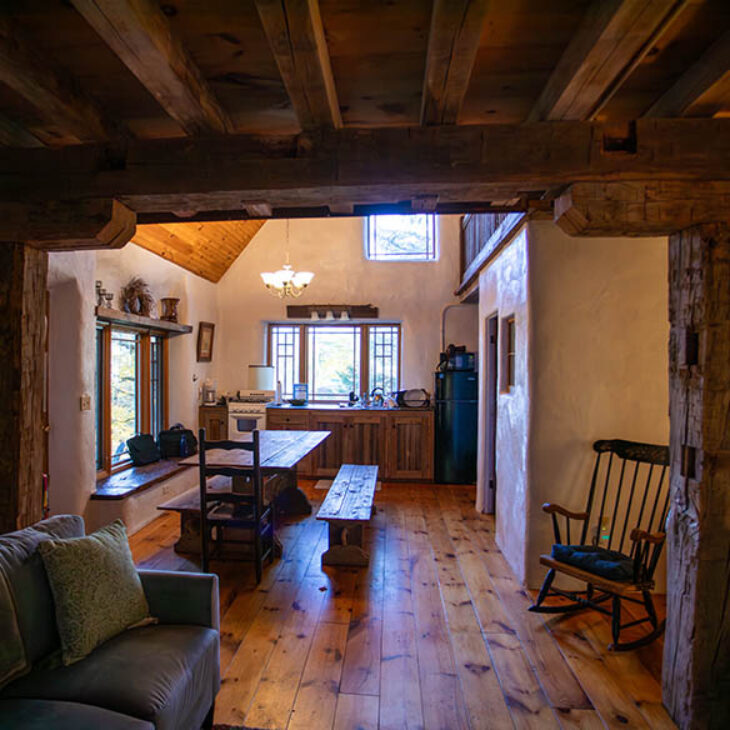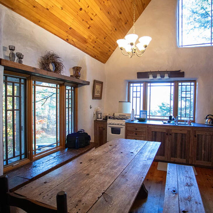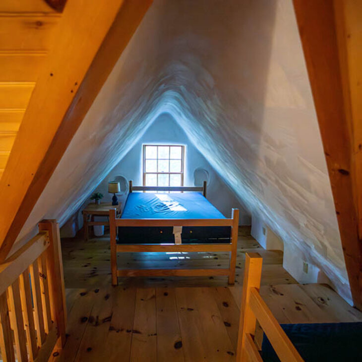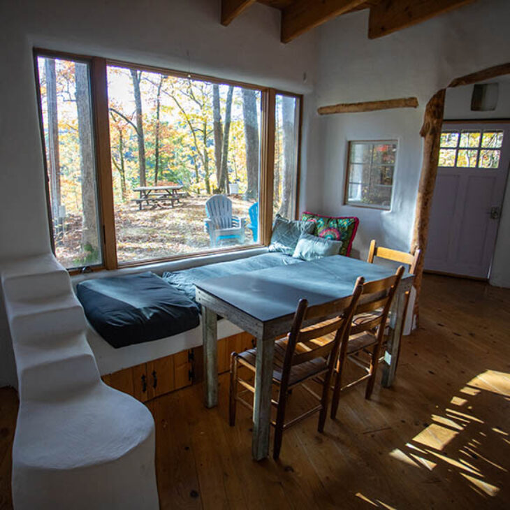 The Strawbale House accommodates 3 to 5 guests with one bedroom and a sleeping loft. This unique natural building was designed and built by Hartwick students and features natural pine floors and plaster walls. Outdoor amenities include an earthen bread oven and fireplace.