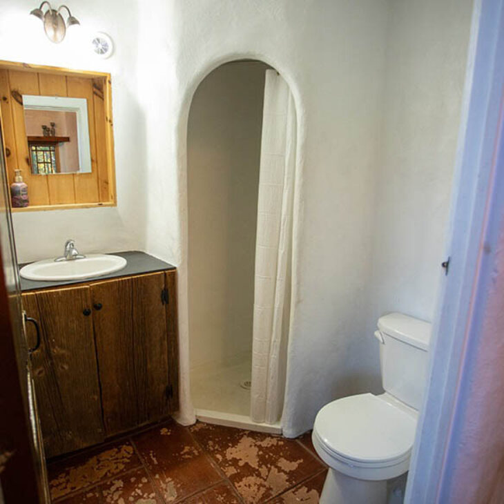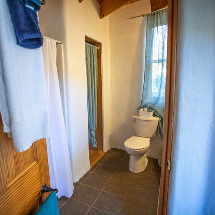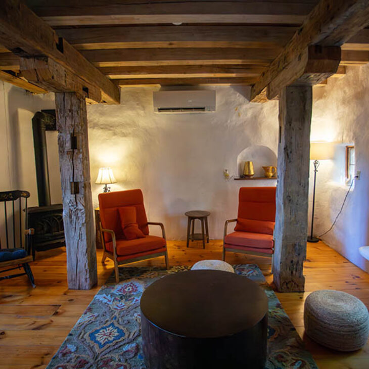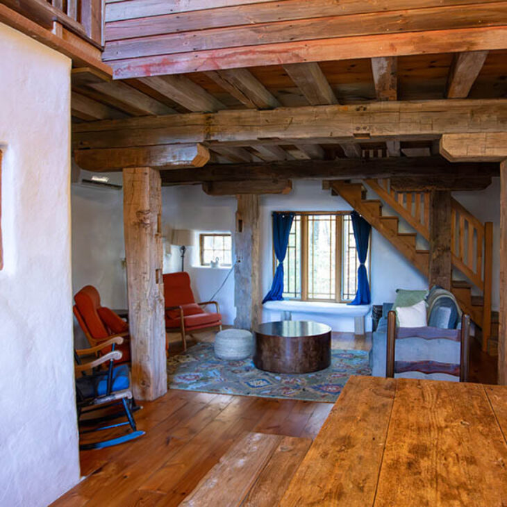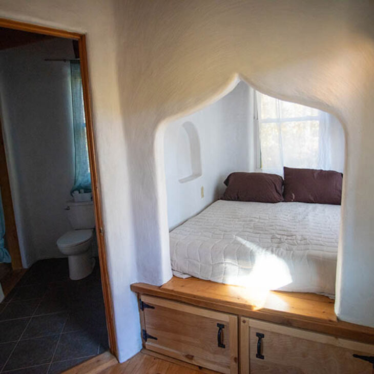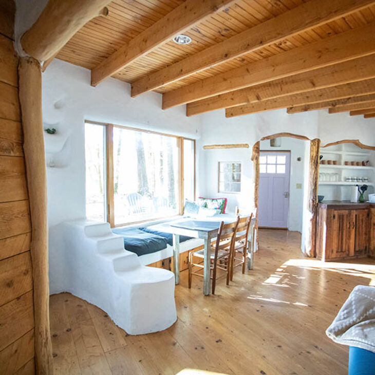 The Cob House sleeps 2 to 4 guests with two sleeping nooks (not full bedrooms). Built from cob—a mixture of sand, clay, and straw—the cabin offers an open living area and is made largely of local and salvaged materials.