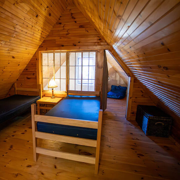 The Crossroads Cabin is a cozy studio-style cabin sleeping 1 to 2 guests with a small roofed porch overlooking the lake. Please note there is no parking at this cabin except for loading and unloading; all vehicles must be parked in Pine Lake’s main or upper parking lots.